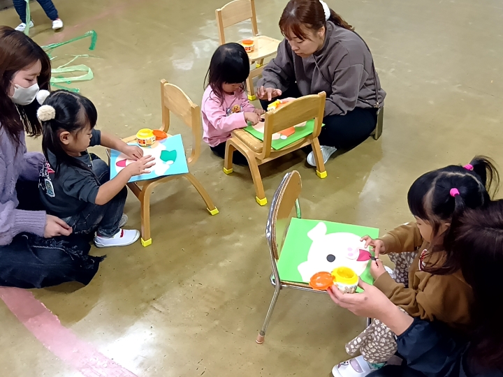 親子で一緒に体操、手遊び、製作など楽しい時間を過ごしていただきます。