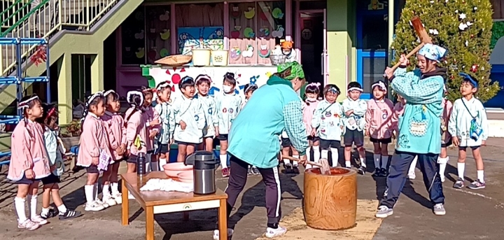 ・おもちつき(みんなで代わる代わるおもちをつきました。幼稚園でお雑煮を食べました。)
